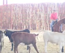 Gerald demonstrates how he cleans a horse’s front end up that is limited in the turn around. He wants to see the inside front foot take a step back and across so the feet aren’t too forward in the turn, once he has isolated the hindquarters. He also talks about how he likes his 2 year olds to have their nose tipped towards the cow when traveling with the cow. In part III, Gerald works a filly that is scared of cattle and does a lot of counter bending around the cows to help her relax, showing her that she can push the cows around and move their feet.