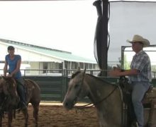 Jonathan gives his non-pro and amateur riders a lesson on the flag before they work cows. He does this so they can get comfortable and find their rhythm, without to much pressure. He lets the flag stay in front of the horse a little, allowing the horse to read the stop. Jonathan explains that you have to leave your hand down when you first start because this allows you to identify where the horse may be cheating.